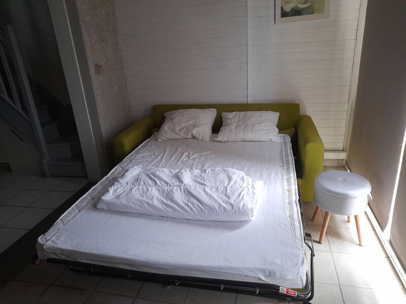 A l’étage 2 chambres (2 lits 140 x 190) et vrai canapé lit dans la loggia